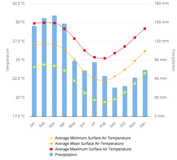 Average Mean Surface Air Temperature (indicated by red squares): This tracks the overall average temperatures monthly, peaking around 32.5°C in February and dropping to about 27.5°C in August.