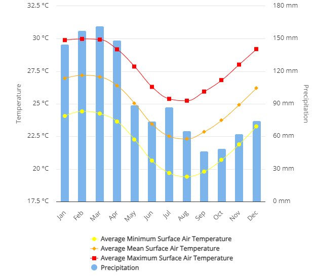 This chart illustrates the climatology of Agalega Island, detailing both temperature and precipitation trends across the year: Temperature Data: Average Minimum Surface Air Temperature (depicted by blue squares): This line represents the lowest average temperatures for each month, which decrease from around 30°C in January to about 22.5°C by July, and then gradually increase towards the end of the year. Precipitation (illustrated by blue bars): The precipitation pattern shows higher rainfall at the beginning and end of the year, with a peak in February (near 180 mm) and a distinct dry period from May through October, where precipitation is considerably lower (below 60 mm in most of those months). Agalega Island therefore experiences a tropical climate with a pronounced warm season at the beginning of the year and a cooler, drier period mid-year. The precipitation pattern suggests a season influenced possibly by monsoonal winds, common in many island climates in the region. This chart is useful for understanding seasonal variations in weather which can affect everything from agriculture to tourism on Agalega Island.