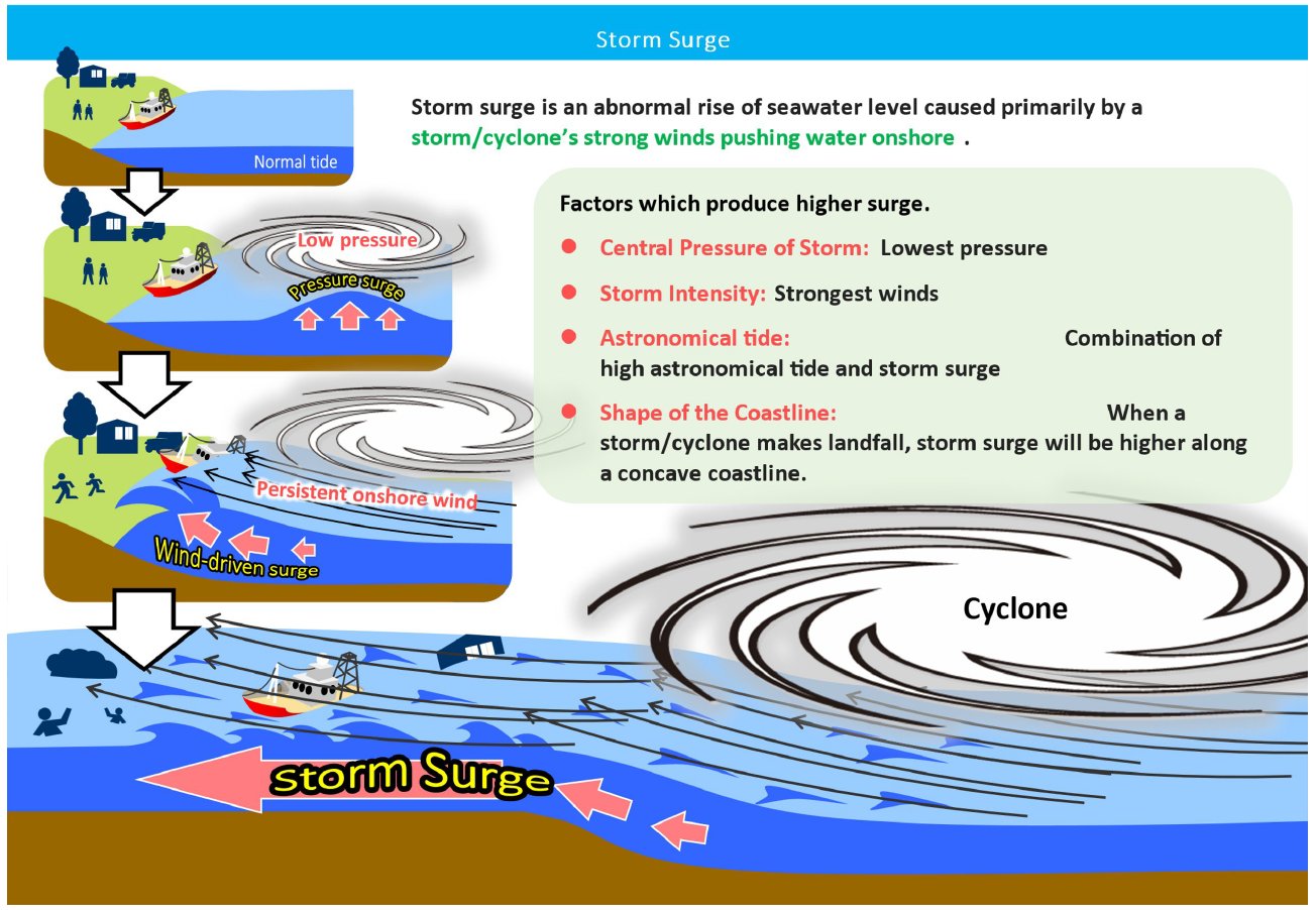 What is a Storm Surge ?Storm surge (maree tempete) is the change in the water level caused by the presence of a storm/cyclone. It is an abnormal rise of water generated by the storm or cyclone, over and above the predicted astronomical tide. Since storm surge is a difference between water levels, it does not have a reference level. In general, storm surge occurs where winds are blowing onshore. The highest surge tends to occur near the “radius of maximum winds,” or where the strongest winds of the hurricane occur. | ||
