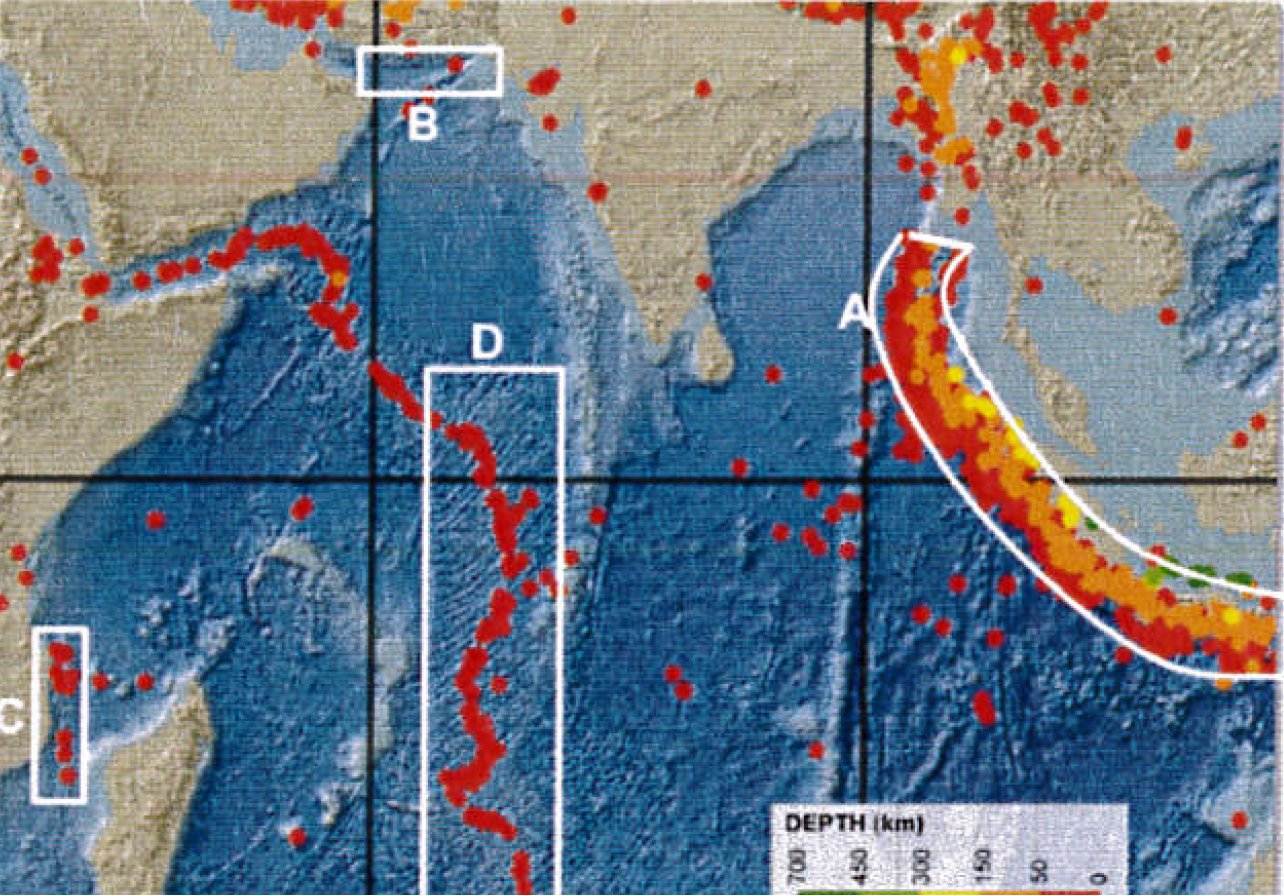 Notable zones include the Sunda Arc, Makran Subduction Zone, Davie Ridge, and the Central Indian Ridge, as detailed in studies by Jaiswal et al., Okal et al. (2008), and Satake (2014).
