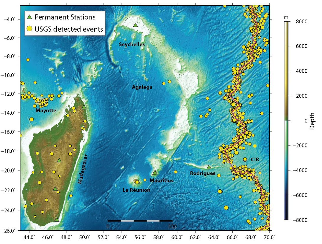 Tsunami Threats While direct seismic threats are low, Mauritius could be affected by tsunamis generated by distant earthquakes. For example, the 26 December 2004 Indian Ocean earthquake and tsunami, which primarily impacted coastal areas around the Indian Ocean, led to increased awareness and preparedness initiatives in island nations like Mauritius. | ![]() Green Triangles: Permanent stations from various global networks Red solid line: Central Indian Ridge Yellow Circles: Earthquake locations from USGS catalogue (1900-2019) source: MOI | |