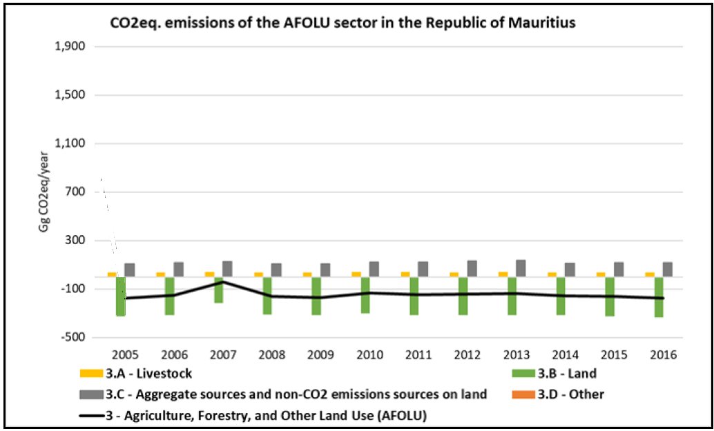The AFOLU sector in the Republic of Mauritius functions as a net sink. This sector encompasses GHG emissions from agricultural activities, including methane (CH4) from enteric fermentation and both methane and nitrous oxide (N2O) from cattle manure management. Another significant source within the AFOLU sector is the aggregate sources and non-CO2 emissions on land (3.C), which includes emissions from biomass burning and both direct and indirect N2O emissions from managed soils and manure management. While harvested wood products (3.D.1) represent a smaller emissions category, the primary sink category is land use, particularly forest land (3.B.1), which contributes to the sector's overall net sink status in Mauritius. Agriculture contributes to greenhouse gas emission primarily through the emission and consumption of GHGs such as methane (CH4), nitrous oxide (N2O) and carbon dioxide (CO2). Methane emissions primarily arise from enteric fermentation in livestock, particularly cattle, as well as from manure management practices that result in anaerobic decomposition. Rice cultivation is another source of methane, especially in flooded fields where anaerobic conditions promote the production of this potent greenhouse gas. The application of synthetic and organic fertilizers on agricultural soils leads to nitrous oxide emissions, a greenhouse gas with a much higher global warming potential than carbon dioxide. Forestry and land use change are critical components of this sector, with deforestation and land degradation contributing to carbon dioxide emissions. When forests are cleared for agriculture or other land uses, the carbon stored in trees and soil is released into the atmosphere, exacerbating climate change. Conversely, forests, wetlands, and other natural ecosystems serve as carbon sinks, sequestering carbon dioxide from the atmosphere and playing a crucial role in mitigating emissions. Reforestation, afforestation, and sustainable land management practices are key strategies to enhance these carbon sinks and reduce emissions from land use change. The AFOLU sector's emissions and mitigation potential are closely tied to land management practices, making it a vital area for action in the broader context of climate change mitigation in Mauritius. This structured overview delineates the diverse sources of GHG emissions within agriculture and underscores its critical economic, social, and environmental roles in Mauritius, illustrating both challenges and contributions to sustainability.