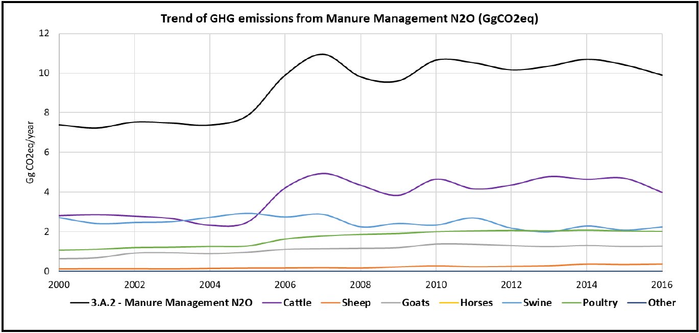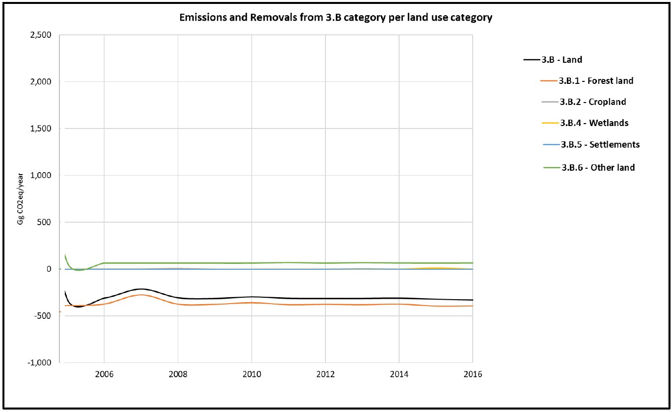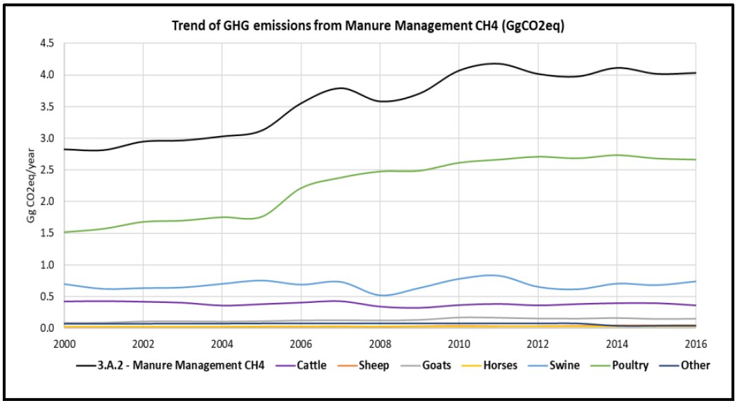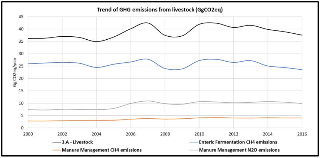 GHG emission trend of AFOLU sector of RoM from 2000 to 2022. source: BTR/NID 2024 The AFOLU sector in the Republic of Mauritius serves as a net sink. From 2000 to 2022, net removals (emissions minus removals) in Mauritius decreased by 5.5%. GHG emissions from agriculture (categories 3.A and 3.C) dropped by 37% over this period, from 140 Gg CO2e to 88 Gg CO2e. Similarly, GHG removals from Land Use, Land-Use Change, and Forestry (LULUCF), specifically categories 3.B and 3.D, fell by 7.4%. In 2022, the predominant category for removals was Forest Land (3.B.1), which accounted for -430 Gg CO2e. Emissions from livestock (3.A) also decreased by 16%, from 44.7 Gg CO2e in 2000 to 37.3 Gg CO2e in 2022. | ||
