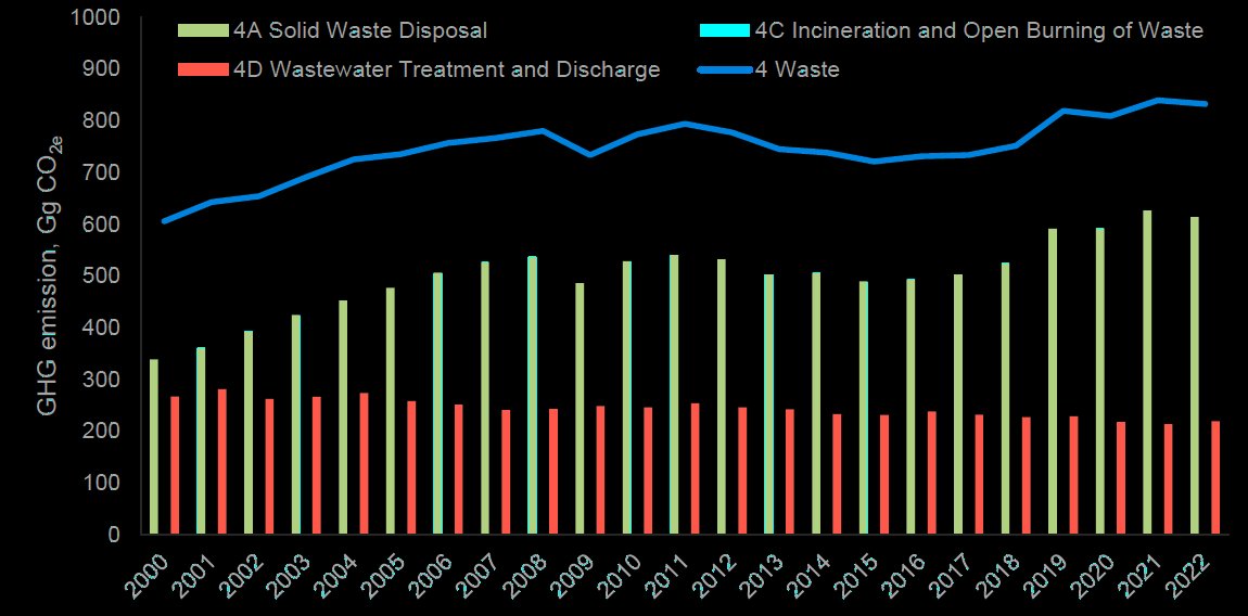 GHG emission trend of Waste sector of RoM from 2000 to 2022. source: BTR/NID 2024 The Waste sector in Mauritius is an important source of greenhouse gas emissions, primarily through the decomposition of organic materials in landfills, which generates methane, a potent greenhouse gas. Solid waste disposal sites, particularly those that manage municipal and industrial waste, are the main contributors to these emissions. As organic waste decomposes anaerobically in landfills, it produces methane, which can escape into the atmosphere if not properly managed through landfill gas capture systems. In addition to landfill emissions, the biological treatment of solid waste, including composting and anaerobic digestion, can also produce greenhouse gases, though these methods are generally considered more sustainable when managed correctly. Waste incineration, while reducing the volume of waste, emits carbon dioxide and other pollutants, depending on the composition of the waste being burned. Wastewater treatment and discharge is another critical component of the Waste sector, where methane and nitrous oxide emissions arise from the treatment processes used in sewage and industrial effluents. The efficiency and technology employed in wastewater treatment plants can significantly influence the level of emissions. Efforts to mitigate emissions from the Waste sector include improving waste management practices, increasing recycling rates, enhancing composting and anaerobic digestion technologies, and upgrading wastewater treatment facilities to reduce methane and nitrous oxide emissions. These strategies not only help in reducing the sector's greenhouse gas footprint but also contribute to broader environmental sustainability goals in Mauritius. GHG emissions from the Waste Sector in Mauritius increased by 37.4% from 2000 to 2022, rising from 605 GgCO2e to 832 GgCO2e. In 2022, the most significant source of emissions within this sector was the solid waste disposal category, accounting for 73.7% of the sector’s total emissions. The second major contributor was wastewater treatment and discharge, which represented 26.2% of the sector's emissions. However, emissions from this category decreased by 18%, from 266.4 GgCO2e in 2000 to 218 GgCO2e in 2022. From 2017 to 2022, there were no emissions from the biological treatment of solid waste due to non-operational equipment. Incineration accounted for only 0.01% of the waste sector's emissions in 2022. The GHG emission trends for Mauritius's waste sector from 2000 to 2022. | ||