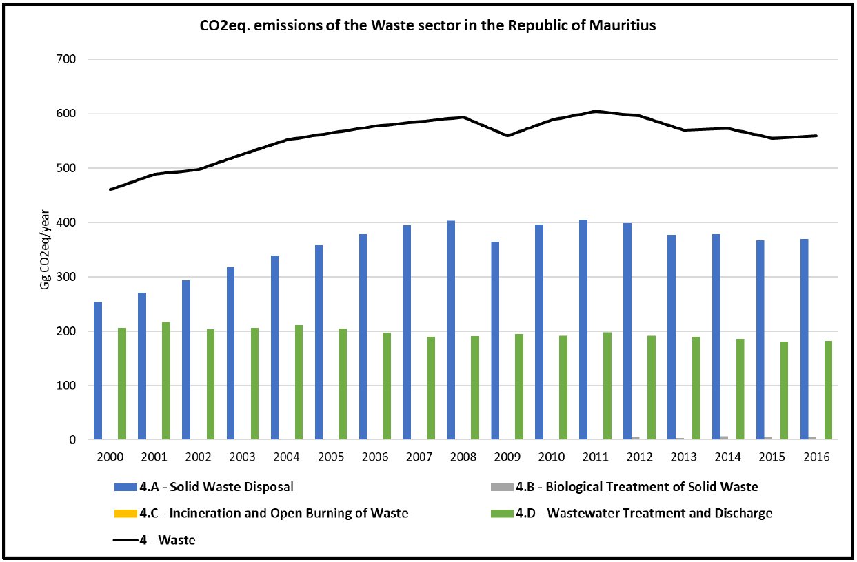 CO2eq Emissions of the Waste sector - Main ComponentsThe graph illustrates greenhouse gas (GHG) emissions from the waste sector in Mauritius, as from 2000. Key Observations: