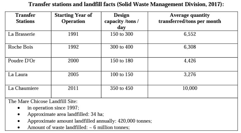 4A & 4B - Solid Waste sectorThe amount of solid wastes generated in Mauritius was over 425,000 tonnes in 2016. Most of the solid wastes are landfilled and a few of them have started to be composted as from 2012. LFG, produced in the landfill, are currently captured for electricity production. Recycling is carried out only at small scales.