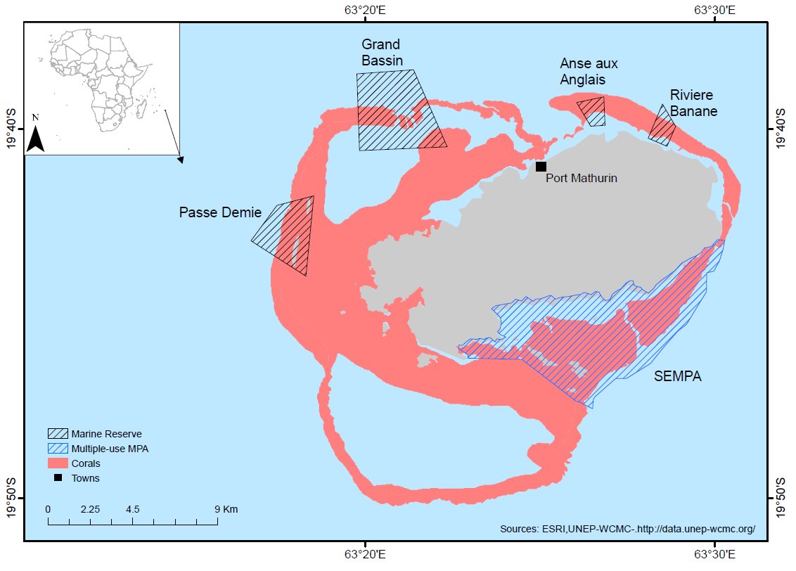1 multiple-use MPA, proclaimed in 2009 - South East Marine Protected Area (SEMPA) in the southeast of Rodrigues. SEMPA spans approximately 43 km², encompasses diverse habitats including reef slopes and seagrass beds. However, its management plan has not yet been fully implemented, indicating a need for increased local capacity in MPA management.
