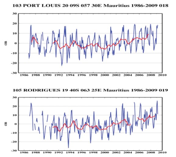 SLR, Tides & WavesBased on tide gauge station data, Emery and Aubrey (1989) calculated a relative sea-level rise of approximately 3 mm/year. Another study suggested a rise of about 1.2 mm/year since 1965, comparable to global sea level changes over the last century (Ragoonaden 1997). Data analysis from 1986 to 2003 showed minimal sea level changes (Ragoonaden 2006a, 2006b). However, recent data from the University of Hawaii Sea Level Centre indicates an acceleration in sea level rise over the past five years, as illustrated in Figures 8 and 9. Additionally, a new sea level station has been installed at Agalega as part of the Tsunami Monitoring Network. The tidal patterns along the coast of Mauritius mirror those of a natural open-ocean setting due to the island's limited continental shelf width. The tides exhibit a semi-diurnal nature, with a tidal range of approximately 0.50 m during spring tides and a smaller amplitude of about 0.20 m during neap tides. Notably, during annual spring tides in March and September, the tidal range can reach up to 0.85 m. In exceptional cases, very low water levels may occur, causing the water to drop more than 1 m below mean sea level. The wave climate in Mauritius is mainly influenced by three primary weather systems: