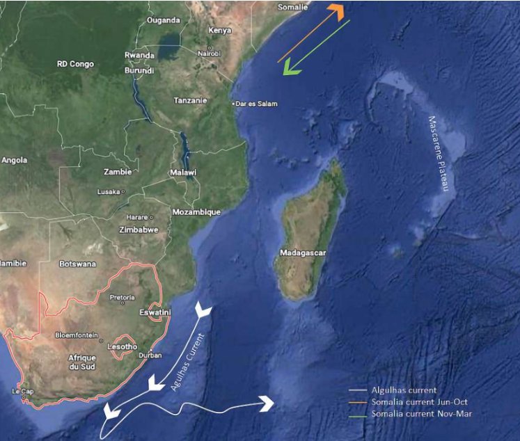 Coastal hydrodynamics and offshore current systemsMauritius is situated in a region predominantly influenced by the persistent South Equatorial Current (SEC), driven by the prevailing trade winds from east to west in the south Indian Ocean. This current, extending from 8 °S to approximately 15-20 °E, exhibits notable seasonal variations in strength. Its intensity peaks during the winter months when robust South Easterly trades dominate the south Indian Ocean. Accelerating as it passes through channels within the Mascarene Plateau, the current creates strong gyres on the leeward side. Upon reaching Madagascar, a portion of the current flows northward to join the Agulhas current in the Mozambique Channel and the East African current. The southern segment flows southward along the Madagascan coast, forming an anticyclone gyre further south. During the South West monsoon, the northward-turning component of the SEC contributes to the Somali current along the East Coast of Africa. Coastal hydrodynamics around Mauritius are additionally shaped by factors such as lagoon bathymetry, the presence of coral reefs, shoreline morphology, tidal patterns, and extreme events like cyclones and storm surges. Notably, waves breaking at an angle to the shoreline generate long shore currents, transporting sediments along the coast in most regions. | ![]() |