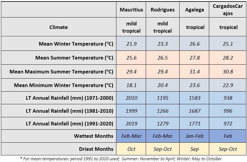 Monthly variation of climate parameters at various locations in Mauritius and Rodrigues (source: BTR1 2024)![]() | ||