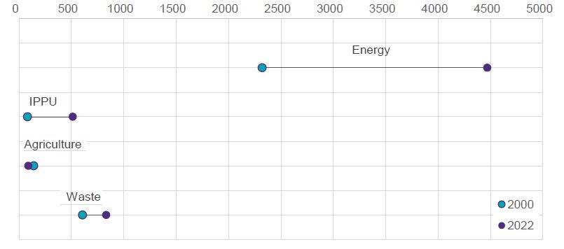 The dominant role of the energy sector highlights its significant impact on the country's GHG emissions profile. | ![]() 2000 emissions vs 2022 emissions (Gg CO2e) | |