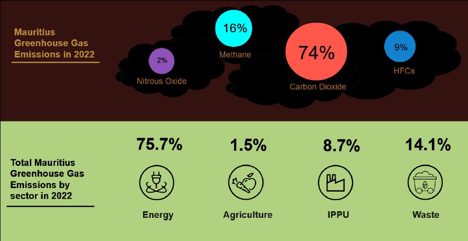 Mauritius has engaged in several initiatives and commitments to address greenhouse gas (GHG) emissions and their impacts on climate change. Some key engagements include: Nationally Determined Contributions (NDCs): Mauritius has committed under the Paris Agreement to reduce its GHG emissions. The country's NDCs include specific targets for reducing emissions by a certain percentage relative to business-as-usual scenarios by 2030. These engagements demonstrate Mauritius's active approach to managing GHG emissions and mitigating climate change impacts, aligning with global efforts and contributing to sustainable development goals. Monitoring of GHG EmissionsMauritius monitors greenhouse gas (GHG) emissions through a structured national system aligned with international guidelines provided by the Intergovernmental Panel on Climate Change (IPCC). This system involves the following key components: National GHG Inventory System: Mauritius has established a comprehensive inventory system that regularly collects data on GHG emissions from various sectors including energy, industry, agriculture, waste, and land use. This system follows the methodologies recommended by the IPCC, which ensure consistency, accuracy, and comparability with international standards. | 1992 - Earth Summit in Rio:Mauritius participated in the United Nations Conference on Environment and Development (UNCED), also known as the Earth Summit, leading to the signing of the United Nations Framework Convention on Climate Change (UNFCCC). 1997 - Kyoto Protocol:Mauritius signed the Kyoto Protocol, committing to GHG emissions reduction targets and participating in mechanisms such as the Clean Development Mechanism (CDM). Obligations/ Outcomes: To achieve the objective of the UNFCCC by setting legally binding quantified emission reduction targets for participating developed countries. Kyoto Protocol entered into force on 16 February 2005. Currently, there are 192 Parties to the Kyoto Protocol. Its first commitment period started in 2008 and ended in 2012. The Doha Amendment was adopted in Doha, Qatar, on 08 December 2012. It relates to the second commitment period, beginning 1 January 2013 and ending in 31 December 2020. Implementation/ Submission: Closure for the CDM projects will be done in 2026 through the submission of reports and issuance of certificate of closure.