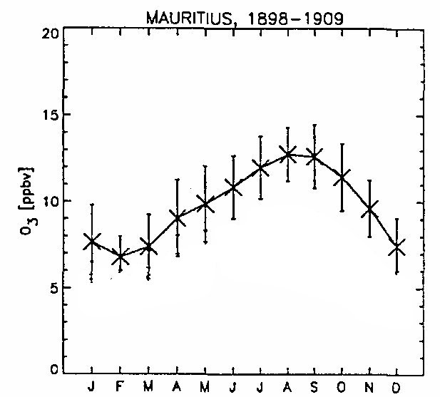 Understanding pre-industrial ozone levels is important for several key reasons: Baseline Measurements: Knowing the pre-industrial levels of ozone provides a baseline against which to measure the increase due to human activities. This helps in assessing the extent of anthropogenic impacts on the atmosphere and how significantly we have altered natural systems. Climate Change Studies: Ozone is a greenhouse gas and plays a significant role in climate dynamics. By understanding its concentration before industrial influences, scientists can better quantify how much ozone contributes to modern climate change and predict future climate scenarios with greater accuracy. Air Quality and Health: Elevated ozone levels are linked to various health problems, including respiratory issues and cardiovascular diseases. Knowing natural ozone levels helps determine the additional risk posed by current concentrations, guiding public health policies and air quality standards. Environmental Policies and Regulations: With a clear picture of how human activities have altered ozone levels, policymakers can devise more effective strategies and regulations to control emissions of ozone precursors, like volatile organic compounds (VOCs) and nitrogen oxides (NOx). Ecological Impact Assessments: Elevated ozone levels can be harmful to vegetation and ecosystems. Understanding pre-industrial levels allows ecologists to assess the degree of damage and stress on plant life and ecosystems, contributing to conservation strategies. | Ozone measurements made using Schonbein's method during the late nineteenth and early twentieth centuries have been examined and converted to modern units by Pavelin et al (1999). Figure below shows the pre-industrial ozone level for Mauritius. Estimates suggest that global background levels of surface ozone were about 5-10 parts per billion (ppb), whereas modern levels can be as high as 40 to 60 ppb in many industrialized areas . ![]() Pre-Industrial Ozone Levels (corrected, average monthly) [source: Pavelin et al. (1999)] |