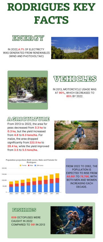 Environment: - Biodiversity: Rodrigues is home to several endemic species of flora and fauna. Conservation efforts are significant due to the fragile ecosystem.