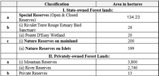 Special Reserves: Comprise 2.3% of the forest area, regulated by Section 11 of the Native Terrestrial Biodiversity & National Parks Act of 2015. "Islet National Parks" , proclaimed in 2004,have been renamed as "Special Reserves" as per the Native Terrestrial Biodiversity & National Parks Act of 2015.