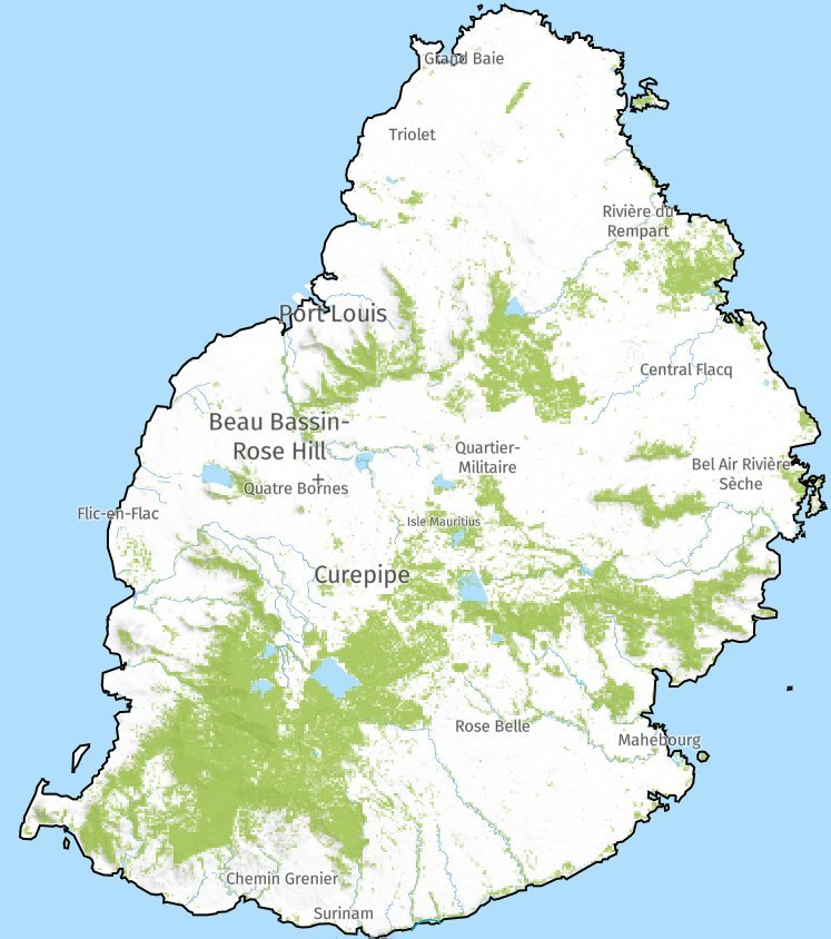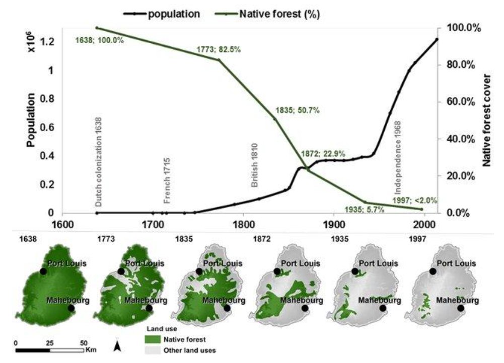Historical Overview of Deforestation in MauritiusFigure shows population growth and deforestation in Mauritius since colonisation. The figure also includes six historical deforestation maps showing native forests (Vaughan and Wiehe 1937, Page and D’Argent 1997*). Ownership and Management of ForestsForests are either State-owned or Privately-owned. The Forestry Service (FS), under the aegis of the Ministry of Agro-Industry and Food Security, oversees state-owned Forest lands and, although privately-owned, the extent of mountain and river reserves, amounting to some 6,540 ha, is protected under the Forests and Reserves Act of 1983. State-owned forests cover around 52.4% while Privately-owned forests cover around 47.6% of forested land (Source: Forestry Service). These areas are under constant surveillance of this Service and any development on these areas require the approval of the Conservator of Forests. It is important to mention here that the figures for privately-owned lands are crude estimates based on expert knowledge from the Forestry Service. It is important to note that there are no communal forests in Mauritius and no communities/indigenous people living within or dependent on the forests. Because of the rising value of land in Mauritius, private forest owners are more inclined to convert their forestlands to more profitable land use such as ecotourism and housing development. (Source National Forestry Policy). Recent Trends in Forest Land UseDuring the past few years, many privately-owned forest lands have been converted to other land uses, such as residential and infrastructural development and agriculture. This has resulted in a significant decrease in privately-owned forests. However, it is to be noted that deforestation has more likely gradually occurred over a span of the past ten years. (Source: Forestry Service) Observations and Studies on Forest DistributionThe Forestry Service has noted a shifting pattern in forest distribution. While climate change could be a contributing factor, comprehensive studies are required to gain a deeper understanding of these changes. *Page WS and D’Argent G (1997). A vegetation survey of Mauritius. Report Commissioned by IUCN, Basel. Mauritian Wildlife Foundation, Port Louis, Mauritius. | Population growth and Deforestation in Mauritius since colonisation source: Sietze Norder et al. (2017) ![]() ![]() | |