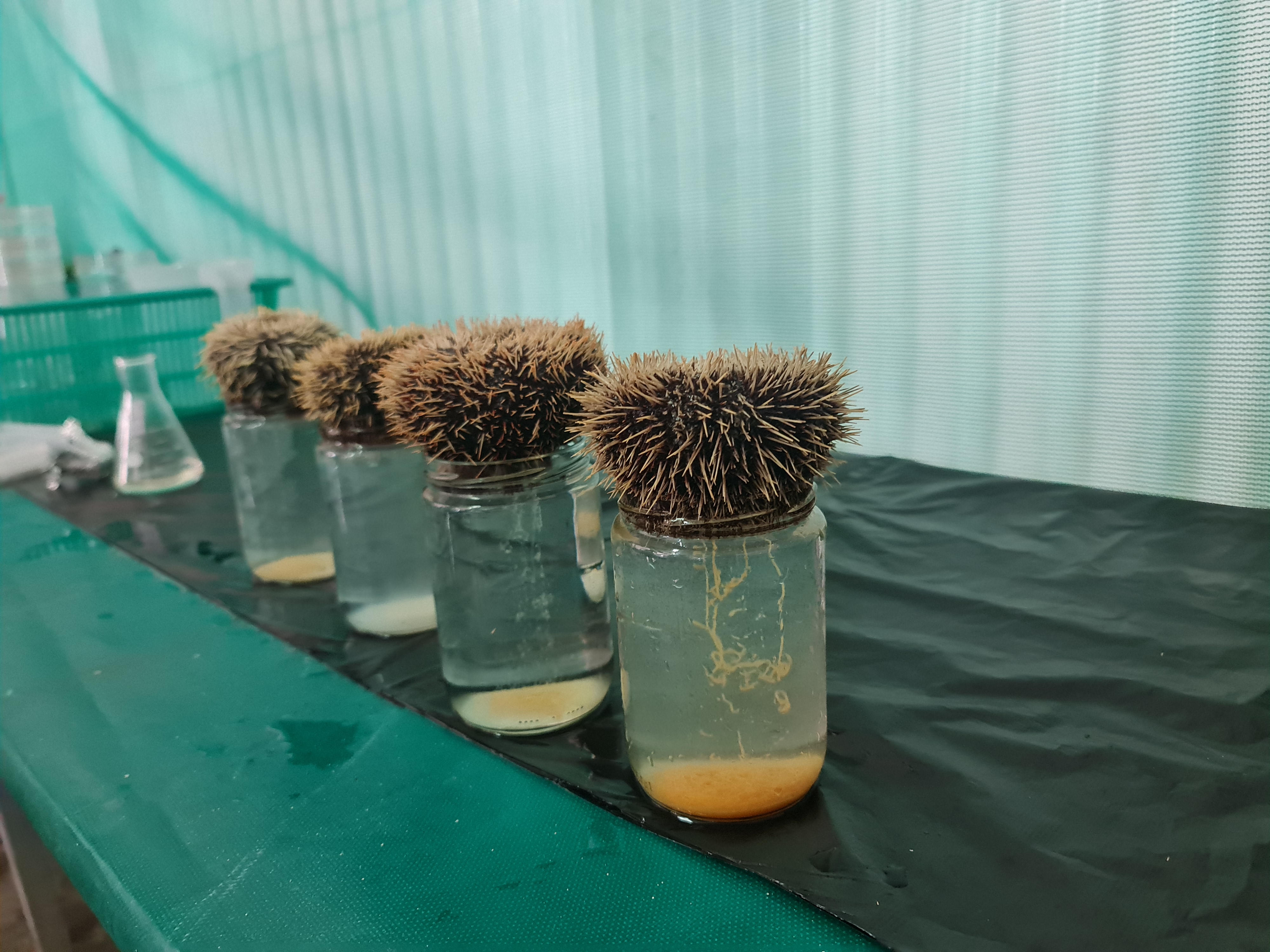 Marine ranching is a process whereby seeds of desired species of marine animals are produced, reared and released in the sea to enhance the natural population for their eventual capture at marketable size by the local fishers. Environmental degradation and overfishing have caused several of the world fisheries to decline. In order to meet the shortfall, marine ranching has been used in several countries to sustain continued production from the marine environment. The Ministry has embarked on a marine ranching programme, since 1997, whereby fish species are being produced at the Albion Fisheries Research Centre for release at selected sites in the lagoon to increase the stock potential. Species targeted for marine ranching are mud crab (Scylla serrata), Silver Seabream (Rhabdosargus sarba), Sea urchin (Tripneustes gratilla), Sea cucumber (Holothuria scabra) and Marine shrimp (Penaeus monodon).