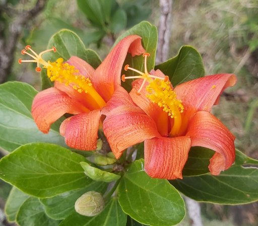 Despite the deforestation, Rodrigues still harbours a significant number of endemic plants. These resilient species include the Mandrinette de Rodrigues (Hibiscus liliiflorus), the ‘Bois gandine’ (Mathurina penduliflora), the ‘Bois fer’ (Eugenia rodriguesensis), the ‘Bois puant’ (Foetidia rodriguesiana), Bois Capot, also known as Bois de Remède, is famous for its medicinal properties and is used in traditional medicine, Bois de Pirogue, has cultural and historical significance, as it was traditionally used for making canoes, Filewood is known for its dense foliage and attractive flowers and Palms such as the Rodrigues fan palm and the Latanier palm. The national flower of Mauritius, Trochetia Boutoniana, is also found on Rodrigues. It has bright red tubular flowers that bloom in abundance. Reforestation initiatives using native species are underway to restore lost habitat and provide vital resources for endemic fauna. ![]() cafe marron flowering (courtesy: MWF) ![]() Mandrinette de Rodrigues (Hibiscus liliiflorus) (courtesy: MWF) | ![]() olea lancea (courtesy: MWF) |
