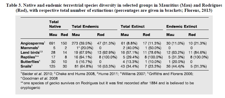 Nine of the endemic species in Rodrigues are represented by fewer than 10 mature individuals in the wild, including three species (Ramosmania rodriguesii, Dombeya rodriguesiana and Gouania leguatii (MWF 2012) which are known from just a single individual. Other species groups show similar levels of endemism.