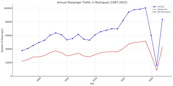 Trends and Observations - Net Movement:Positive values indicate more arrivals than departures, suggesting a net inflow of passengers into Rodrigues. Negative values indicate more departures than arrivals, suggesting a net outflow. | ![]() |