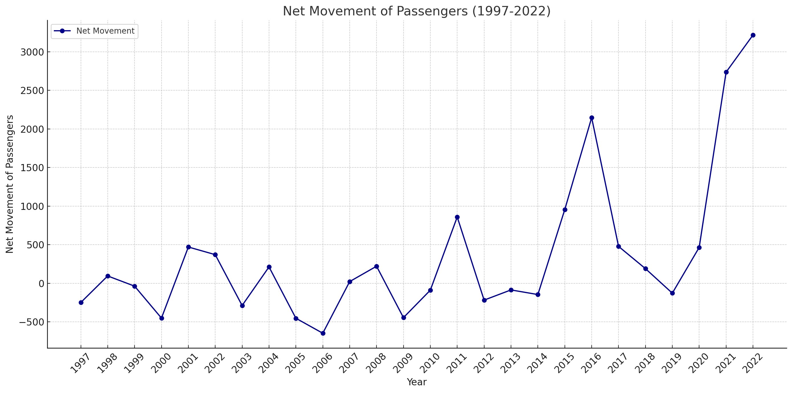 Trends and Observations - Total Traffic:There has been significant variation in passenger traffic over the years, with some years showing marked increases or decreases. The years 2021 and 2022 show particularly high net inflows, which may indicate recovery or changes in travel patterns due to specific events (potentially COVID-19 pandemic impacts).