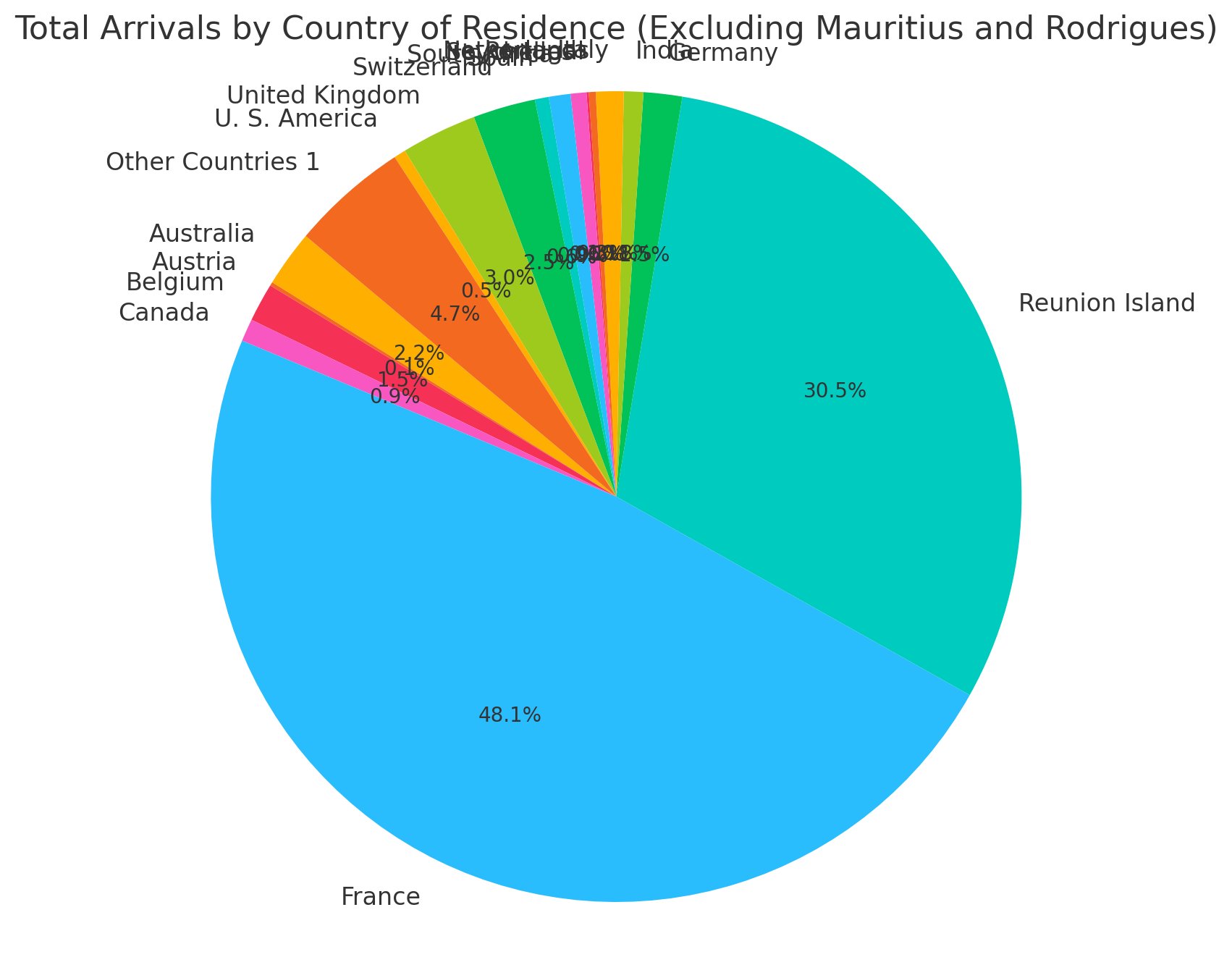This chart highlights that France and Reunion Island contribute significantly to the arrivals, with France accounting for nearly half of these, followed by Reunion Island at about 30.5%. Other countries include Australia, Austria, Belgium, Canada, and many others.