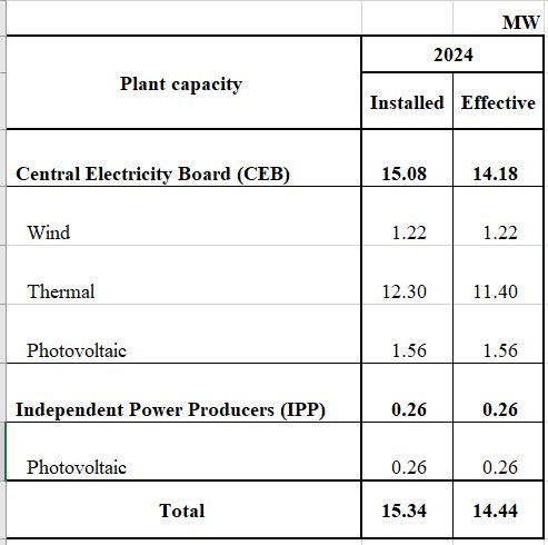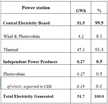 Management of energy consumption on Rodrigues is overseen by the Ministry of Energy and Public Utilities, not by local governance. The island does not have indigenous fossil fuel sources and lacks hydropower capabilities. There are also energy supply concerns during cyclonic seasons due to reliance on imported fuels. The heavy reliance on burning fossil fuels for electricity generation significantly impacts greenhouse gas emissions and hence on air quality. The majority of electricity generated is from diesel and fuel oil as sources, highlighting the ongoing dependence on non-renewable energy sources. ![]() | ||