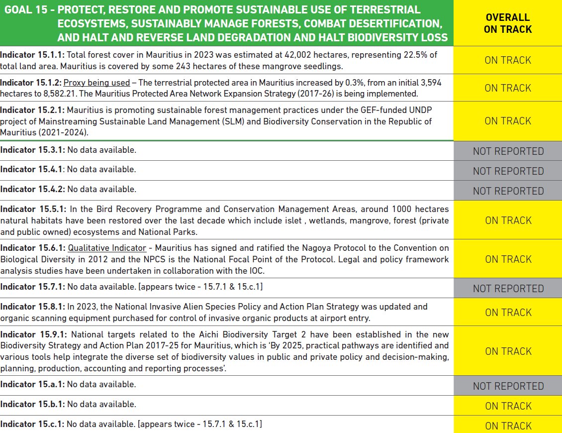The Republic of Mauritius Voluntary National Review (VNR) 2024 addresses SDG 15: Life on Land, focusing on protecting, restoring, and promoting the sustainable use of terrestrial ecosystems, managing forests, combating desertification, halting land degradation, and preserving biodiversity. Mauritius’ environmental strategies and resilience efforts provide a basis for inferring its progress.