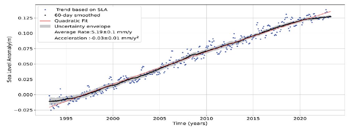 Acceleration:-0.03 ± 0.01 mm/year, suggesting a very slight deceleration in the rate of sea level rise, though within uncertainty limits this may not be statistically significant.